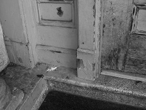 Lead Paint Pealing off of a door and wall, exposing toxins.